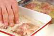 鶏もも肉に小麦粉を薄くまぶし、溶き卵をくぐらせ、パン粉をつける。