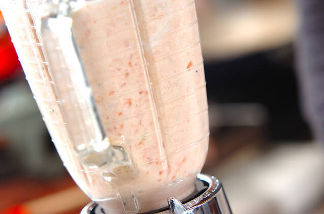 氷以外の材料をミキサーに入れ、トマトの形がなくなる位までかくはんし、氷を入れたグラスに注ぐ。