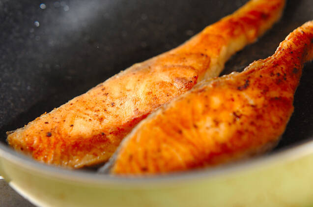 サーモンに塩コショウをして薄く小麦粉をつけ、フライパンにサラダ油小さじ1を中火で熱し、両面焼き色が付くまで焼き、取り出す。