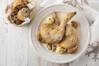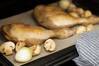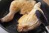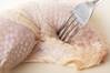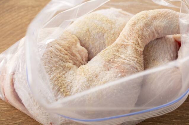 鶏肉は室温に戻す。骨に沿って切り込みを入れ、皮目にフォークで穴を開ける。ポリ袋に入れ、塩コショウをまぶして揉み込み30分ほど置いておく。
