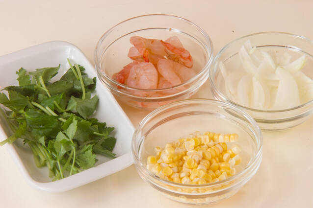 むきエビは背ワタをとり、塩水で洗って水気を拭き取る。玉ネギは縦に薄切りにし、トウモロコシは粒を包丁でこそげ取る。ミツバは3cmの長さに切る。