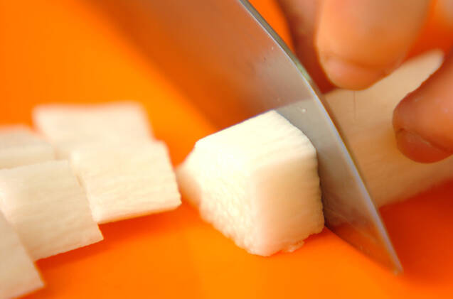 長芋は皮をむき、サッと水洗いしてキッチンペーパーで包んで水気を拭く。プチトマトくらいの大きさに切る。