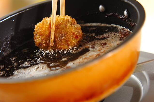 (2)に<衣>の小麦粉、溶き卵、パン粉を順につけ、170℃の揚げ油で、色よくサクッと揚げる。