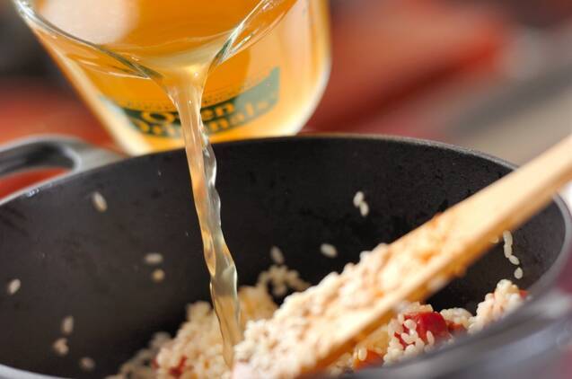 さらに栗、<スープ>の材料、シイタケのもどし汁100mlを加えて混ぜ合わせる。一度沸騰させてから蓋をして弱火で30~35分ほど炊く。