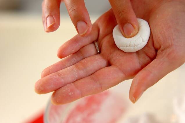 白玉を食べやすい大きさに丸めて指先で少し押しつぶし、たっぷりの熱湯に入れる。