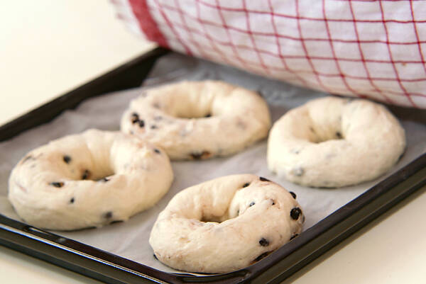 オーブンシートをひいた天板に乗せ、生地が乾かないようにぬれ布巾をかぶせて最終発酵させる。(30℃、10分)指に粉をつけて生地の目立たない所を軽く押し、生地が戻ってこなければ最終発酵終了。