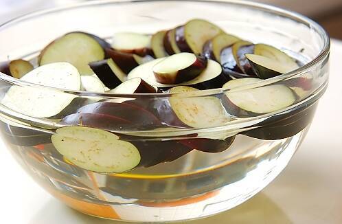 ナスはヘタを切り落として、1cm位の斜め輪切りにして水に放ち、アクを抜いて水気を拭き取る。