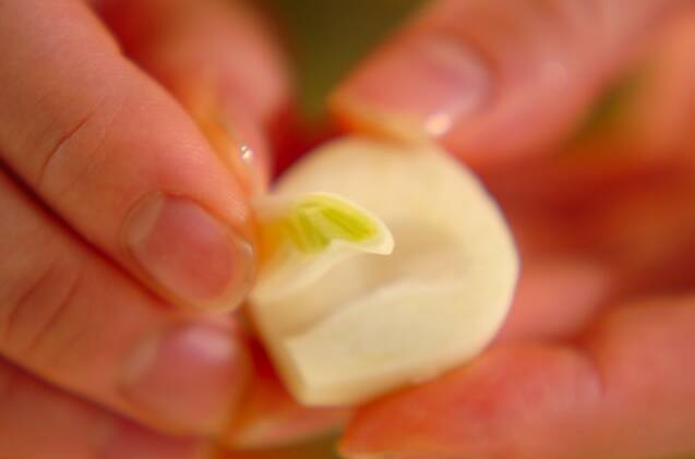 ニンニクは縦半分に切って芽を取り、ジャガイモは皮をむき、乱切りにして水に放ち、玉ネギは縦薄切りにする。