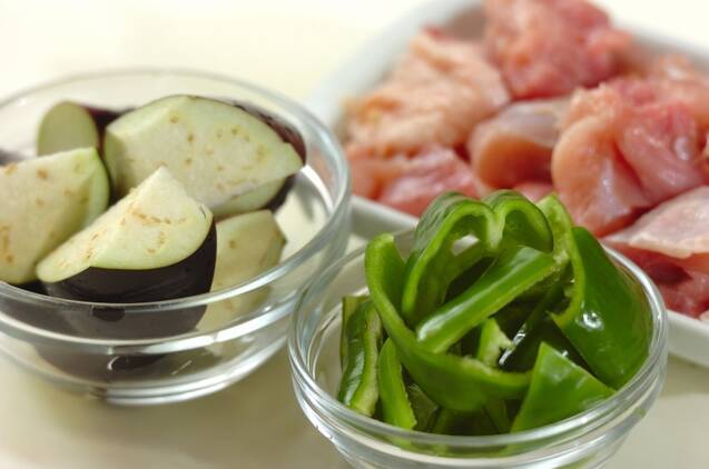 鶏もも肉はひとくち大に切る。ナスはヘタを切り落として乱切りにし、水に放つ。ピーマンは縦半分に切り、ヘタと種を取って乱切りにする。