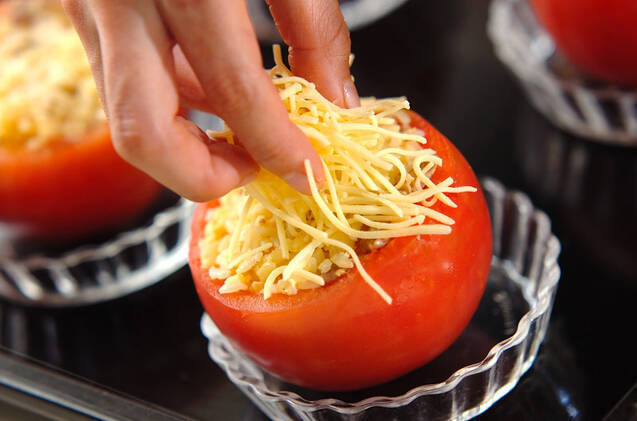 塩コショウで味を調え、トマトカップに詰め、ピザ用チーズを全体にのせる。