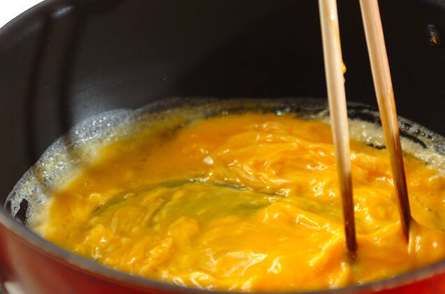 フライパンにサラダ油小さじ2を強火で熱し、溶き卵を一気に流し入れる。菜ばしで大きく混ぜ合わせ、かたまったらいったん取り出す。
