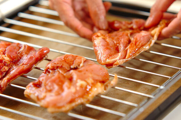 オーブンの焼き網に薄くサラダ油をぬり、鶏もも肉の皮を下にして並べ、200℃に予熱しておいたオーブンで10分焼く。