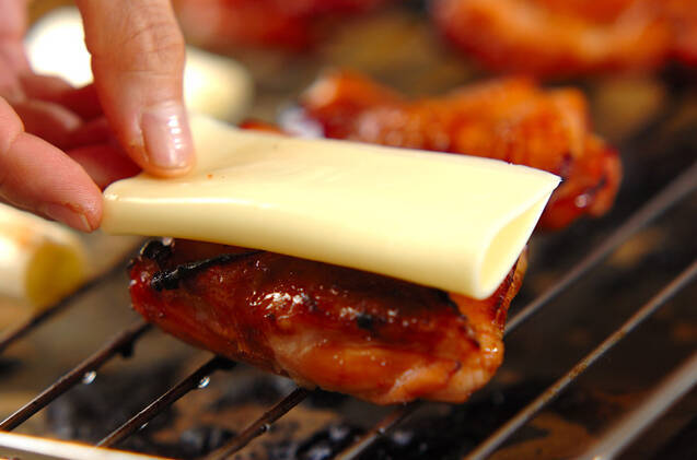 鶏もも肉2切れに半分に折りたたんだスライスチーズをのせ、オーブンのドアを閉めて余熱でスライスチーズを溶かす。