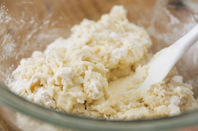 ボウルに残りの材料をすべて入れる。(1)を少しずつ加えゴムベラで混ぜる。粉がボウルにつかなくなってきたらまな板の上に出し手で捏ねる。