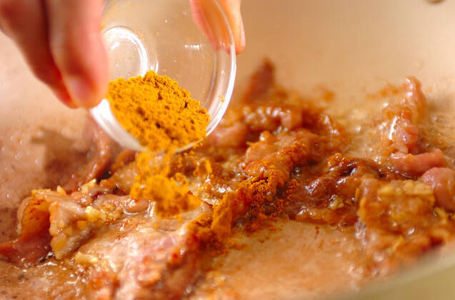 フライパンにサラダ油、バター、ショウガを入れて熱し、香りがたったら(1)の豚肉を加え、火が通ったらカレー粉を加えて炒め合わせる。