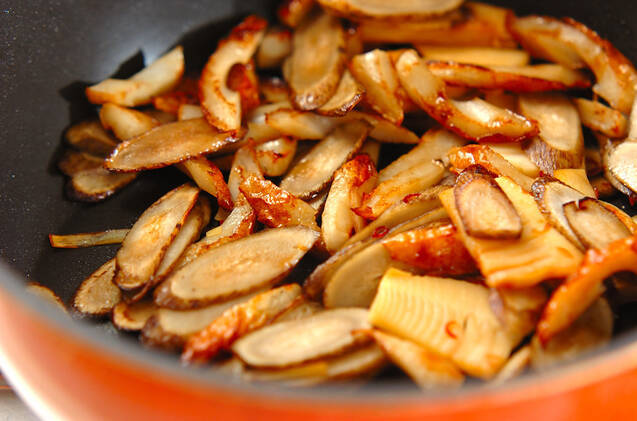 <調味料>の材料を加え、汁気がほとんどなくなるまで炒め合わせ、器に盛る。