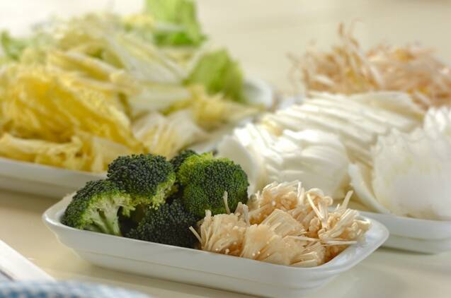 白菜は水洗いし、葉は食べやすい大きさのザク切りにし、白い部分は削ぎ切りにする。
