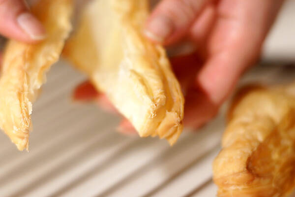 冷凍パイシートは半分に切って、200℃に予熱したオーブンで12~15分サクッと焼き、十分に冷ましてから、層に沿って3~4枚に割る。
