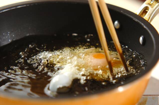 卵を1個ずつ静かに揚げ油に入れ、卵黄をつぶさないように気をつけて、菜ばしで卵白をまとめながら揚げる。