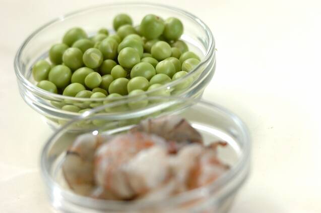 グリンピースはサヤから実を取り出す。エビは殻と背ワタを取り除き、片栗粉と塩でもんで水洗いし、分量外の塩少々をまぶす。