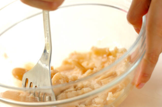 白花豆はマッシャー等でつぶしておく。