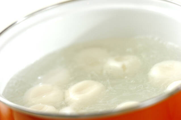 <白玉団子>を作る。白玉粉に水を少しずつ加えながら、耳たぶ位の固さになるまで練り合わせる。白玉を食べやすい大きさに丸めて指先で少し押しつぶし、たっぷりの熱湯に入れる。浮き上がってきたら1~2分ゆでて氷水に取り、冷たくなったらザルに上げる。