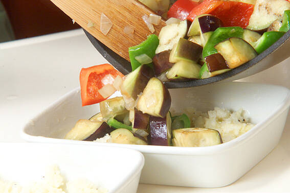 フライパンにオリーブ油大1を熱し、みじん切りにした玉ネギ、水切りしたナス、乱切りのピーマン、赤ピーマンを軽く炒めあわせる。薄くバターをぬった耐熱容器にジャガイモを入れ、その上に入れる。