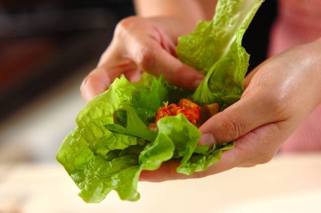 サンチュに大葉をのせ、焼いた豚バラ肉を白菜キムチと一緒に巻いて食べる。