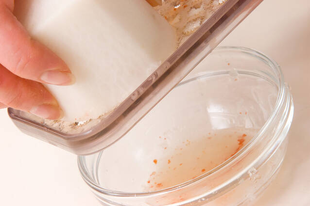 大根は皮をむき、菜ばしを縦に突き刺して穴をあけ、種を取った赤唐辛子を差し込む。10分程おいてからすりおろし、ザルに上げ軽く汁気をきる。