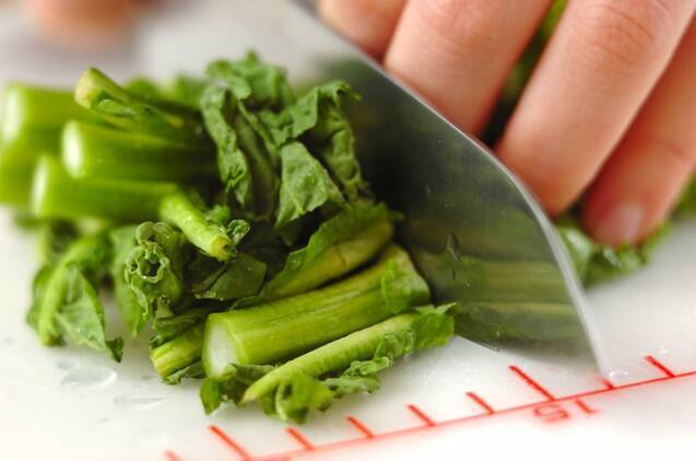 菜の花は軸のかたい部分を切り落とし、食べやすい長さに切って水に放ち、シャキッとしたらザルに上げる。太い場合は縦2~4等分に切る。
