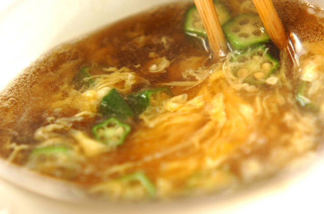ひと煮たちしたら<水溶き片栗>を加え、トロミがついたら溶き卵を加える。菜ばしで大きく円を描く様に混ぜ、卵がふんわりしたら火を止め、器に注ぐ。