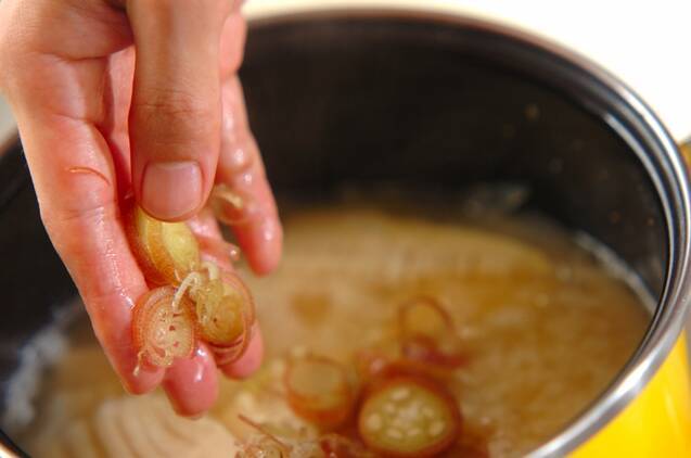 みそを溶き入れてミョウガを加え、器に注ぐ。