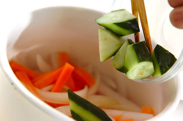 熱いうちに<漬け汁>に(1)を加えて漬け、キュウリを加える。粗熱が取れたら冷蔵庫で保存する。食べる前に器に盛る。