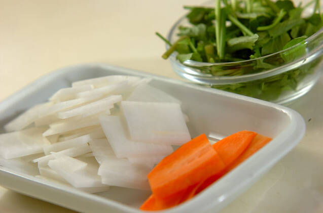 大根、ニンジンは皮を厚めにむき、短冊切りにする。