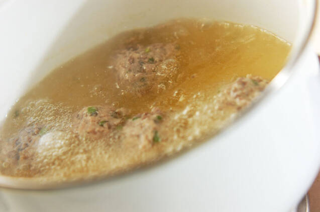 鍋にだし汁を中火で熱し、煮たったら(1)をスプーンなどで丸めながら加え、浮き上がってきたらいったん取り出す。