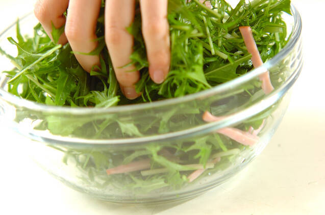 ボウルに水菜とハムを入れ、混ぜ合わせる。器に盛ってクルミを散らし、<ドレッシング>をかける。