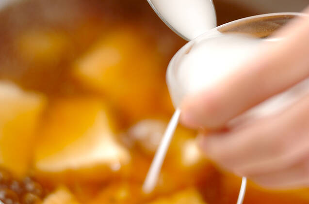 <水溶き片栗>でとろみをつけ、ショウガ汁を加える。