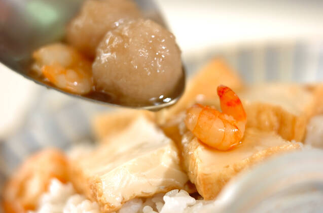 温かいご飯の上に5をかけ、炒り白ゴマを散らして貝われ菜をのせる。