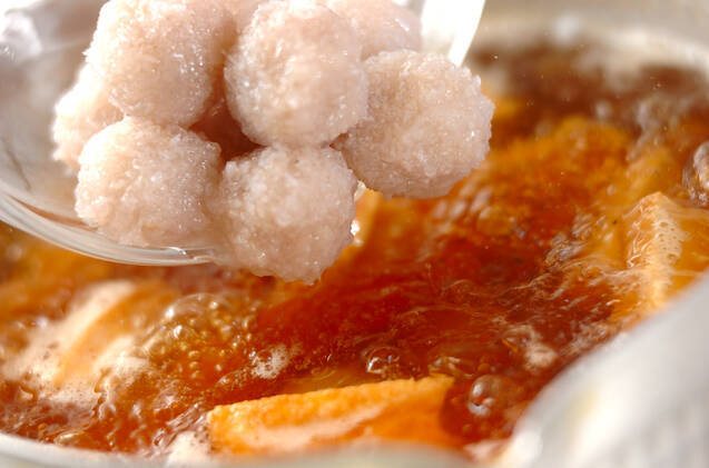ひと煮立ちしてきたらエビ、厚揚げ、<レンコン団子>を加え軽く煮る。