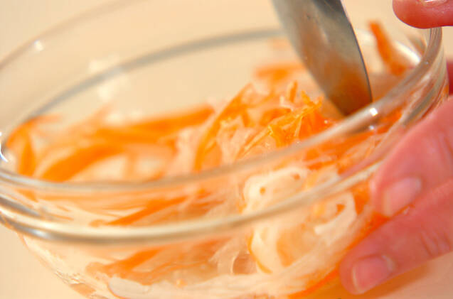 (1)の水気を絞り、ボウルに合わせた<調味料>の材料に10分程度漬け、味をなじませる。