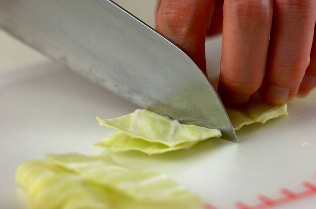 キャベツはザク切りにして鍋に入れ、水を加えて中火にかける。煮たったら火を弱め、鍋に蓋をしてしんなりするまで蒸し煮にする。