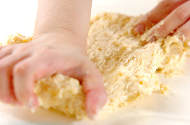 ボウルの中で生地がまとまったら台に移し、手のひらで生地を台にこすりつけながら、台や手に付かなくなるまでこねる。弾力が出てきたら、ときどき台に生地をたたきつけ、さらにこねる。