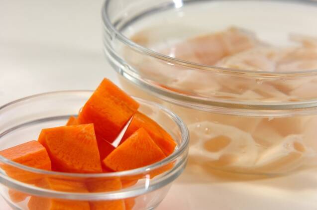 レンコンは皮をむいてひとくち大に切り、酢水に放つ。ニンジンは皮をむき、ひとくち大に切る。