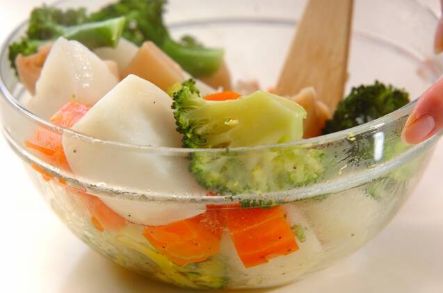 全ての蒸し野菜を<ドレッシング>のボウルに移して和え、器に盛る。