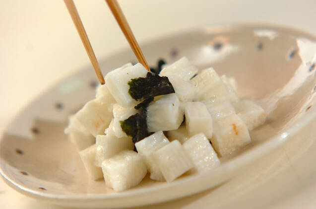 長芋は1cm角に切り、焼きのりをからめて器に盛り、<かつお梅肉>をのせる。