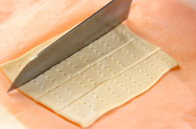 冷凍パイシートは常温に置いて少し柔らかくし、薄く伸ばしてフォークで穴をあけ、4つの棒状に切る。