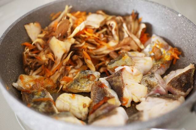 ニンジンがしんなりしたら、タラに片栗粉をまぶし、フライパンのあいているスペースで表面を焼く。