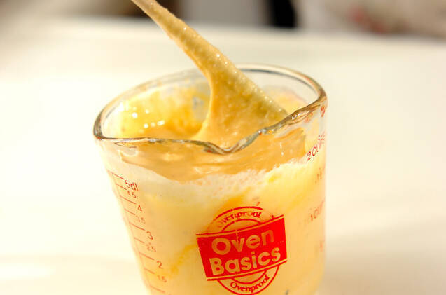 卵は常温にもどして溶きほぐし、粉チーズ、生クリーム、砂糖、塩コショウを加えて混ぜ合わせる。