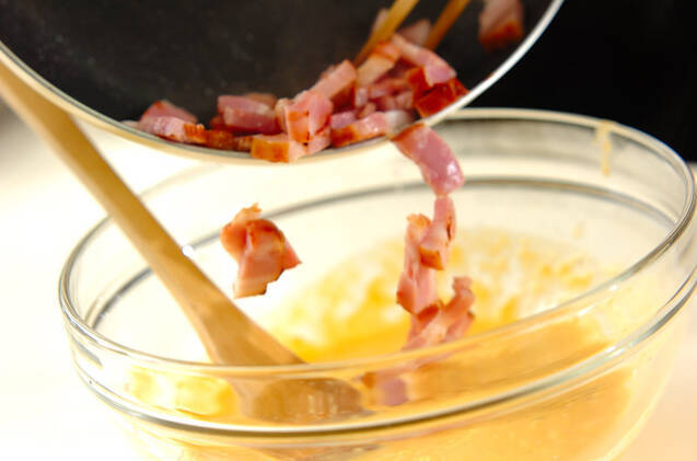 フライパンをサッと洗い、ベーコンを焼き色がつくまで焼き、(2)のボウルに加える。ショートパスタも加えて全体に混ぜ、器に盛る。あればイタリアンパセリを飾り、お好みでコショウを振って下さい。