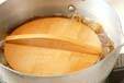 だし汁、<調味料>を加えて強火にし、煮立てば落とし蓋をして、落とし蓋に煮汁が当たり全体に煮汁が広がる火加減で、煮汁が少なくなるまで煮る。